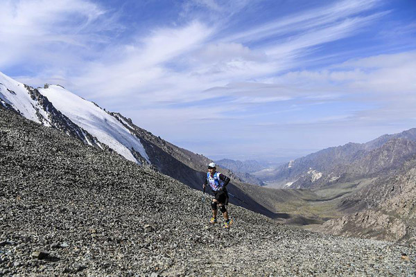 7月29日,参赛者穿越碎石路段。 当日,“2018环博格达峰系列赛之4040FKT”越野赛在新疆乌鲁木齐市达坂城区白杨沟举行,赛事吸引了不少越野爱好者。本次赛道全长16公里,累计爬升近1500米。起伏的赛道与天山博格达峰相互映衬,风景壮美。