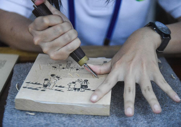 7月29日,大学生在体验刻刀的使用技法。当日,“笔墨纸砚文化之旅——第九期海峡两岸大学生文化体验营”在浙江杭州正式启动,40名两岸大学生在首站杭州十竹斋艺术馆感受国家级非物质文化遗产——木版水印技艺的独特魅力。