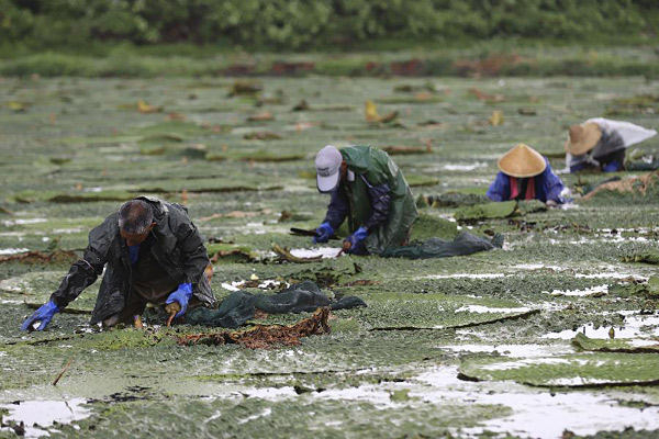 7月29日,江苏省淮安市洪泽区岔河镇农民在采收芡实。 近日,岔河镇种植的芡实迎来采收季,种植芡实的水塘中一派丰收的繁忙景象。
