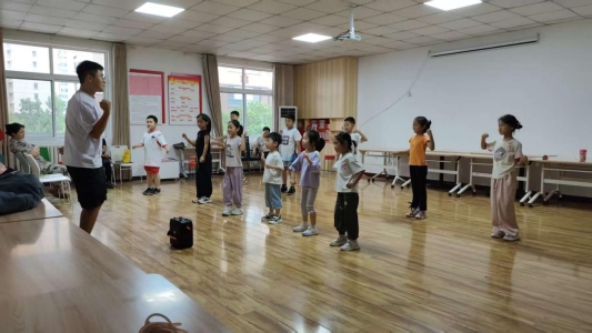 随着歌曲《水果歌》的节奏活动开始了,孩子们跟随着老师的动作运动了起来。动作简化为“苹果蹲跳(屈膝半蹲后轻跳)、香蕉侧腰(单手举高向侧弯腰)、葡萄碎步(原地小步快踏)”,教练逐人纠正姿势,重点提醒“蹲跳时膝盖不超过脚尖”。