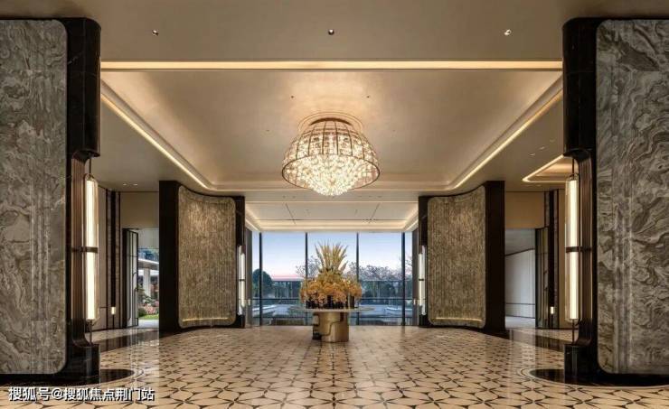 如果近距离看,项目的入口细节之处又不是奢华,尤其是大面积的奢石运用(梵高白奢石+古驰黑石材),绝对是大手笔,再搭配四根梵高白立柱托起古铜色铝板,层层抬升,豪宅大院的气质扑面而来。