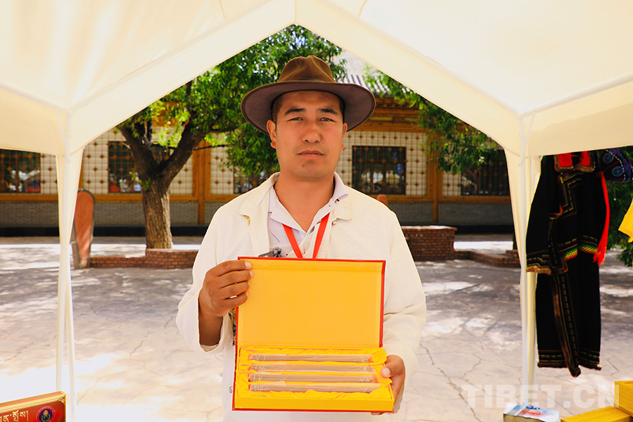 “我今天主要带来的是我们的工艺产品‘供养藏香’,这些包装样式不一的藏香根据规格大小都有各自的价位,但每一根藏香上付出的心血及所使用的工艺和配料都一致,其中我们也更注重藏香的配料,都是精心筛选的白檀香、藏红花、安息香、白黑沉香、甘松等二十多种源自高原的天然药物和香味植物。”当问到目前的销售情况时,他坦言道:“今天卖出去的并不是很多,不过今天能和众多的优秀手工艺人同台参展机会难得,对我来说也是一种学习和展现的契机。”
