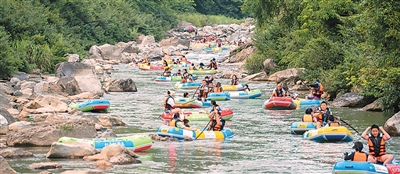 景区创新推出“小七孔世遗探险部落”业态,在精品景点卧龙潭至鸳鸯湖2.5公里水域投入独木舟、背包艇等“玩水”产品。