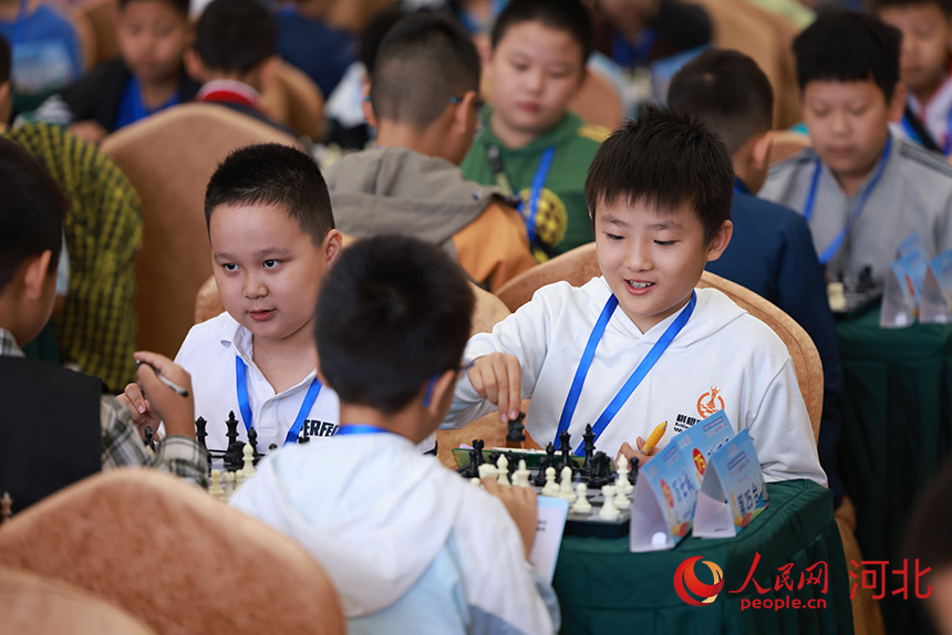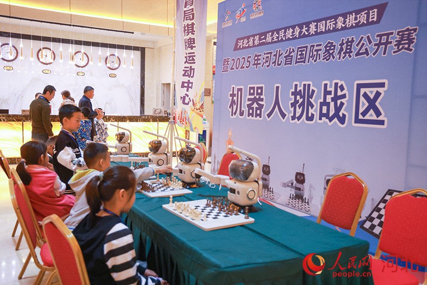河北省第二届全民健身大赛国际象棋项目的小选手们正在与机器人对弈。人民网记者 李兆民摄