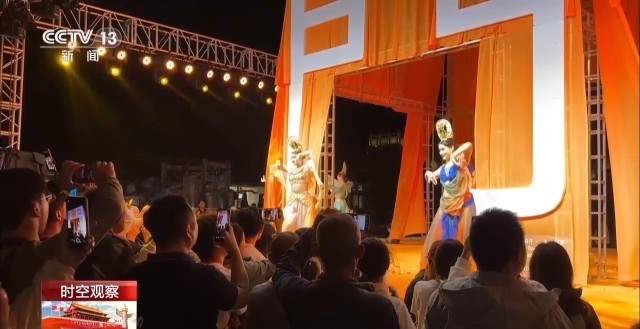 凤凰刚过,敦煌古乐随即响起。在天门洞这座天然画框前,五位“飞天”舞者身着敦煌霓裳登场,民俗与山水在此刻完美交融。
