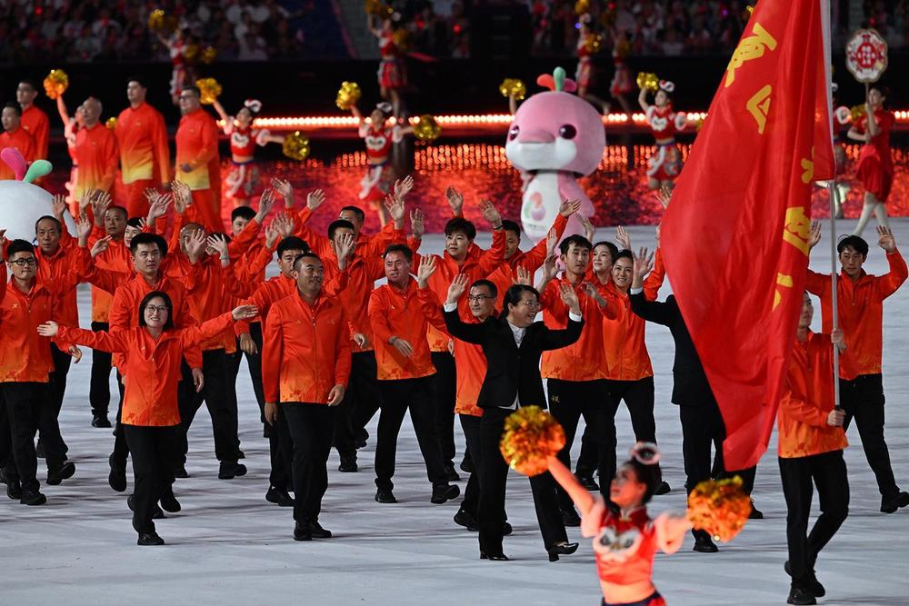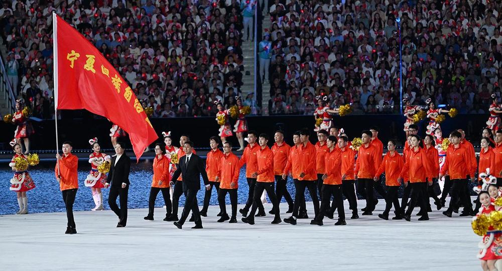 开幕式上,宁夏代表团第二十九个踏入广东奥体中心,代表团成员接受来自全场的欢呼。运动员们向全场观众挥手致意,他们坚毅的眼神、自信的笑容,与全场观众期待的目光交汇。他们的步伐,踏出了塞上江南的沉稳,也带着黄河奔流的激情。