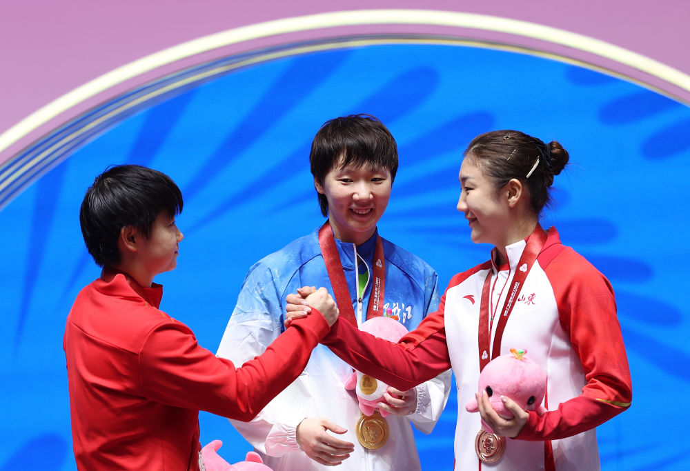 11月16日,乒乓球女子单打冠军黑龙江队选手王曼昱(中)、亚军河北队选手孙颖莎(左)和季军山东队选手陈梦在颁奖仪式上。新华社记者 陈斌 摄