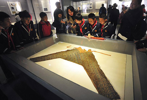 9月24日,在位于乌鲁木齐的新疆博物馆,参观者在“尼雅·考古·故事——中日尼雅考古30周年成果展”上观看“长乐大明光”锦女裤。此次展览从9月22日持续到2019年1月。
