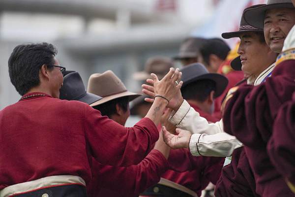 9月24日,运动员们在颁奖台上相互握手致意。当日,第四届中国·青海国际民族传统射箭精英赛在青海省海东市化隆回族自治县落下帷幕。