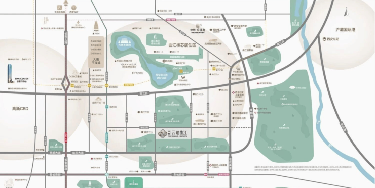 曲江德闳学校、康桥国际学校等菁英教育资源西北妇女儿童医院、西安中大国际医院等权威医疗机构万众国际、曲江创意谷、万象城等商业矩阵W酒店、文华东方酒店、华尔道夫酒店等商务配套汉唐马术俱乐部、射击射箭俱乐部、国际高尔夫俱乐部、SPA养生会所等定制级休闲娱乐鼎配教育、医疗、商配与公园群落共生,凝萃超配生活天赋芯址。
