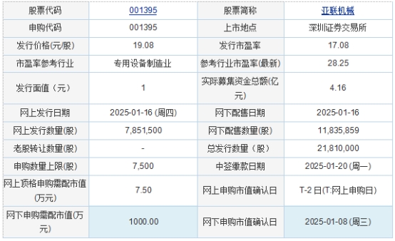 亚联机械2025年1月15日披露的首次公开发行股票并在主板上市发行公告显示,按本次发行价格19.08元/股计算,预计公司募集资金总额为41,613.48万元,扣除预计发行费用5,435.15万元(不含增值税、含印花税)后,预计募集资金净额为36,178.33万元。