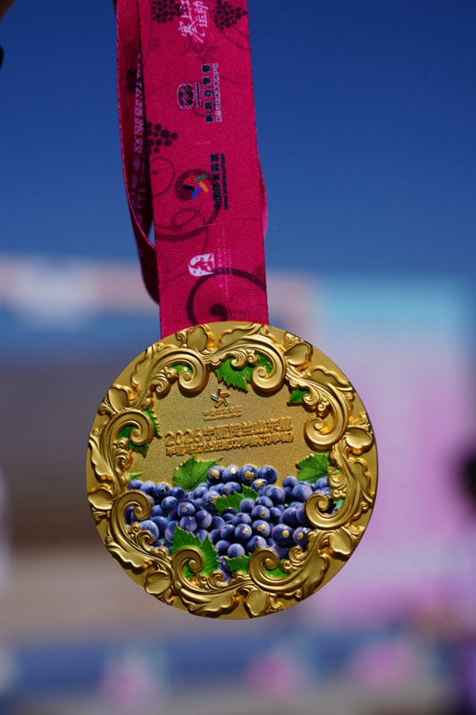 据介绍,本届赛事服装以海棠花、贺兰山波纹为核心元素,勾勒贺兰山下春日盛景与赛道蜿蜒之姿,融合成灵动奔跑人物线条,兼具美感与动感。奖牌以“山为骨 葡为魂 跑为韵”为理念,正面以酿酒葡萄彰显地域标识,背面镌刻贺兰山山脉轮廓,背景搭配葡萄酒橡木桶纹理,将地域文化、葡萄酒特色与马拉松精神完美融合。